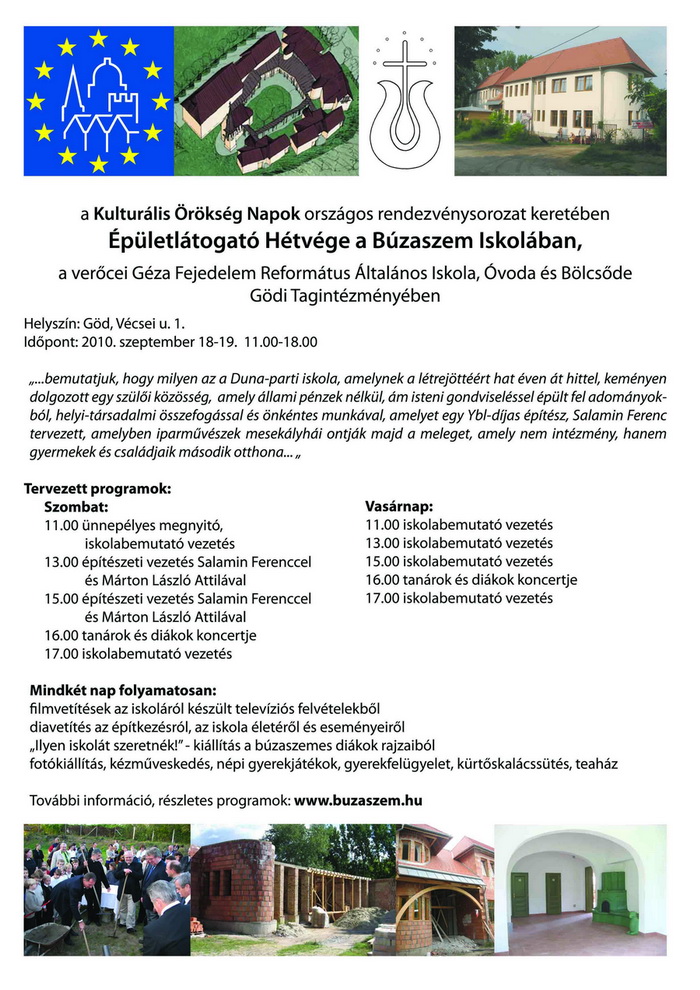 A Kulturális Örökség Napok országos rendezvénysorozat keretében Helyszín: Göd, Vécsei u. 1. „...bemutatjuk, hogy milyen az a Duna-parti iskola, amelynek a létrejöttéért hat éven át hittel, keményen dolgozott egy szülői közösség, amely állami pénzek nélkül, ám isteni gondviseléssel épült fel adományokból, helyi-társadalmi összefogással és önkéntes munkával, amelyet egy Ybl-díjas építész, Salamin Ferenc tervezett, amelyben iparművészek mesekályhái ontják majd a meleget, amely nem intézmény, hanem gyermekek és családjaik második otthona... „ Tervezett programok: Vasárnap: Mindkét nap folyamatosan: További információ, részletes programok: